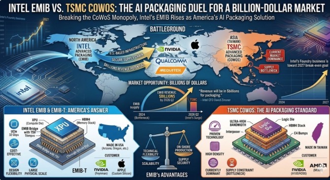 인텔은 이 공백을 파고들었다. 자사의 EMIB(Embedded Multi-die Interconnect Bridge) 기술을 외부 고객사에 개방하며 파운드리 서비스로 확대한 것이다. IT 전문 매체 Wccftech는 지난 6일(현지시간) 보도에서 "인텔이 미국 내 유일한 첨단 패키징 인프라를 바탕으로 TSMC 의존도를 줄이려는 팹리스 기업들의 대안으로 급부상하고 있다"고 분석했다.