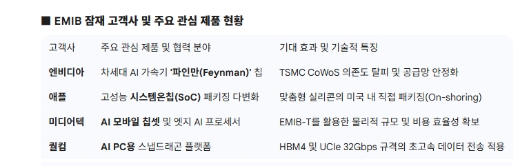 업계에 따르면 현재 인텔 EMIB 채택을 검토 중인 고객사는 엔비디아, 애플, 미디어텍, 퀄컴이다.