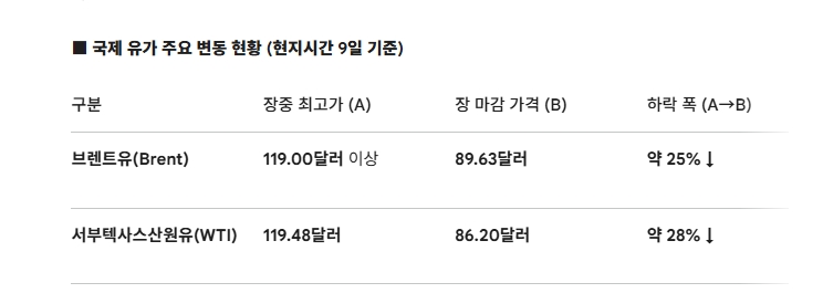 브렌트유·WTI, 장중 2022년 이후 최고점 찍은 뒤 20% 이상 급락… 단일 거래일 최대 낙폭