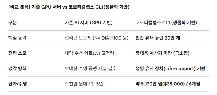 코르티컬랩스가 개발한 CL1 유닛의 핵심은 에너지 효율의 극대화다. 혼 웽 총(Hon Weng Chong) 최고경영자(CEO)는 최근 블룸버그와의 인터뷰에서 "CL1의 전력 소모량은 휴대용 계산기보다 적다"고 단언했다. 이는 현재 AI 시장을 지배하는 GPU가 막대한 전력을 소모하며 열을 뿜어내는 것과 정반대의 지점이다.