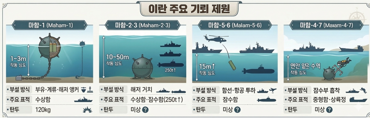 마함-2와 마함-3은 수심 10~50m 해저에 설치되어 선박의 소음, 자기 신호, 수압 변화를 복합 감지한 뒤 최적의 폭발 위치를 스스로 찾아가는 '지능형' 기뢰다. 250t 이상의 수상함은 물론 잠수함까지 표적으로 삼는다. 마함-5와 마함-6은 잠수함 전용이며, 소형 보트나 잠수부가 연안 얕은 수역에 직접 부설하는 방식을 취한다. 선체에 자석으로 흡착하는 흡착 기뢰(Limpet Mine) 마함-4와 마함-7은 잠수 요원이 상선 선저에 직접 부착하는 방식으로, 항구 내 정박 중인 선박도 공격 대상이 된다.