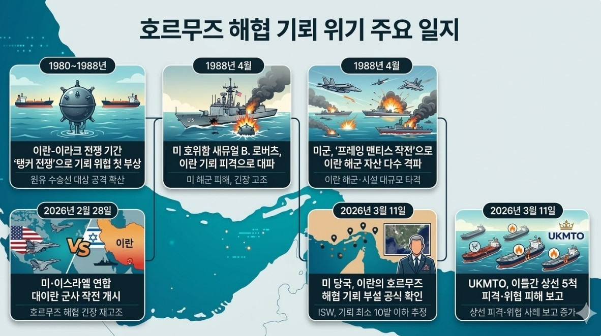 이번 호르무즈 기뢰 위기는 1980년대 이란-이라크 전쟁 당시 발생한 '탱커 전쟁(Tanker Wars)'의 망령을 소환하고 있다. 당시 이란이 부설한 계류식 기뢰 'SADAF-02'가 1988년 4월 미 호위함 새뮤얼 B. 로버츠(USS Samuel B. Roberts)함의 선저를 강타해 대파시키자, 로널드 레이건 행정부는 즉각 '프레이잉 맨티스(Praying Mantis) 작전'을 발동했다. 이 작전으로 미군은 이란 해군 함정 다수와 석유 플랫폼을 초토화했다. 당시 교전은 제2차 세계대전 이후 미 해군이 치른 최대 규모의 해상 전투로 기록돼 있다.