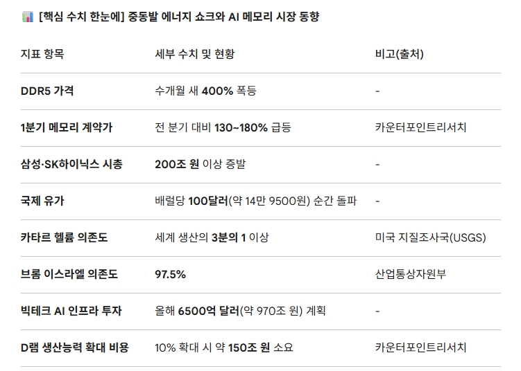 이미지 확대보기이란·이스라엘 전쟁이 장기화 조짐을 보이면서, 인공지능(AI) 반도체 수요 폭발로 이미 임계점에 달한 메모리 가격에 중동발 에너지·원자재 충격이 겹쳤다. 전쟁 발발 이후 국제 유가는 배럴당 100달러(약 14만9500원)를 순간 돌파했고, 삼성전자와 SK하이닉스의 합산 시가총액은 200조 원 이상 증발했다.