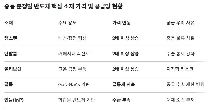 이미지 확대보기대만 디지타임스와 글로벌 반도체 업계는 13일(현지시각) 기준, 반도체 제조 핵심 광물 가격이 단기간에 최대 3배까지 치솟았다고 보고했다. 단순한 가격 변동이 아니다. 한국 반도체 산업의 수익 구조 전반을 뒤흔드는 구조적 충격이 가시화되고 있다.