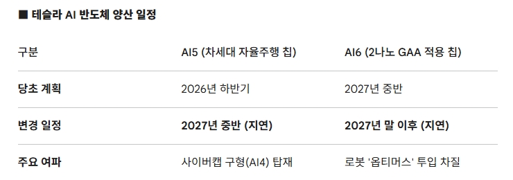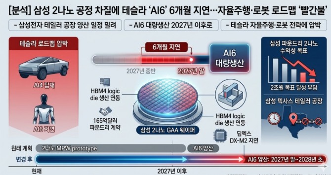 전기차·자율주행 전문 매체 일렉트렉(Electrek)은 지난 12(현지시간) 삼성전자의 2나노미터(nm) 공정 시제품 생산(MPW) 일정이 당초 4월에서 약 6개월 연기됐다고 보도했다. 이로 인해 테슬라의 차세대 인공지능(AI) 반도체 'AI6' 칩의 대량 양산 시점이 2027년 말 이후로 밀렸다. 테슬라가 AI6를 자율주행차와 로봇에 탑재하는 시점은 사실상 2028년 이후로 늦춰질 가능성이 높아졌다.