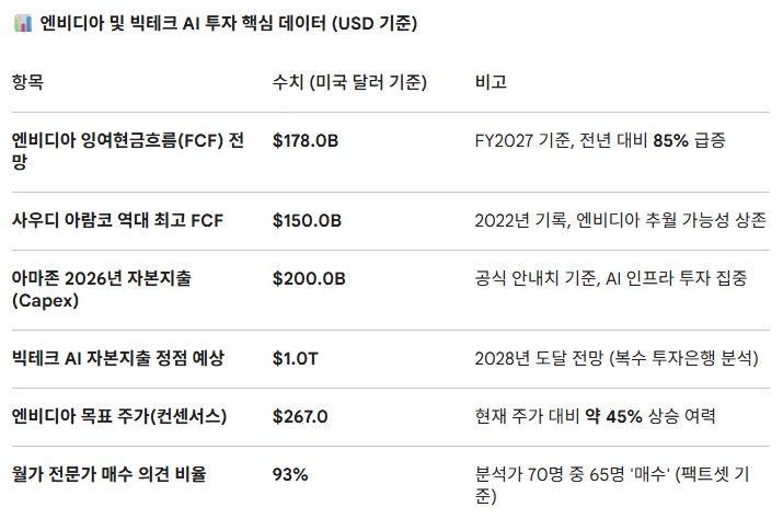 이러한 수익의 원천은 빅테크 기업들의 역대급 AI 설비투자다. 아마존은 올해 데이터센터와 AI 인프라 확충에 2000억 달러(약 299조 원)를 투입하겠다고 공식 안내했다. 복수의 투자은행 분석에 따르면 주요 빅테크 기업들의 AI 자본지출 합산액은 2028년 1조 달러(약 1499조 원) 규모로 정점을 찍을 전망이다.
