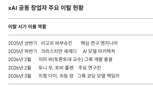 가장 최근인 이달 초에는 xAI의 그록 코딩 모델 개선을 이끌었던 궈둥 장이 "마지막 날"이라는 글을 X에 올리며 퇴사를 알렸고, 지항 다이도 뒤를 이었다. 테크크런치(TechCrunch)에 따르면 이들의 이탈은 머스크가 xAI의 코딩 AI 도구가 앤스로픽의 '클로드 코드(Claude Code)'나 오픈AI의 '코덱스(Codex)'와의 경쟁에서 밀린다고 질책한 직후 나온 것이다.