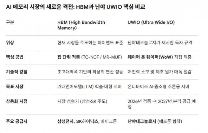 공략 시장도 뚜렷하게 구분된다. 삼성·하이닉스가 엔비디아 H100·B200 등 초고성능 AI 학습용 GPU 시장을 중심으로 HBM 공급을 확대하는 반면, 난야는 스마트폰·PC 등 온디바이스 AI 기기와 중소형 추론 서버를 핵심 타깃으로 설정했다. 대만 증권가 관계자는 "구글 TPU(텐서처리장치)와 같은 맞춤형 AI 가속기와 UWIO를 결합하려는 전략이 구체화되고 있다"며 "한국 기업들의 경쟁 우위가 상대적으로 약한 가성비 중심의 추론용 시장에서 강력한 변수가 될 수 있다"고 분석했다.