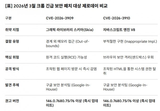 CVE-2026-3909는 해커가 만든 웹 페이지에 접속하는 것만으로 악성코드가 자동 실행된다는 점에서 일반 사용자 피해가 광범위하다. CVE-2026-3910은 크롬의 보안 격리 공간인 '샌드박스(Sandbox)'를 뚫고 사용자의 운영체제(OS) 전체를 원격에서 통제할 수 있어, 파급력 면에서 더 위험하다는 것이 보안 업계의 공통된 분석이다.