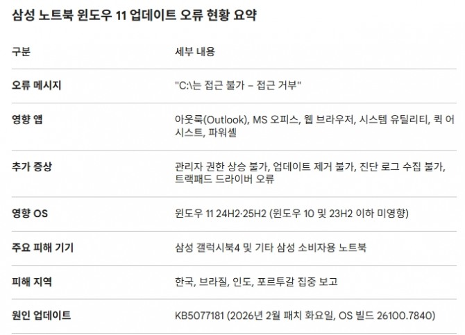 2월 보안 업데이트 KB5077181 설치 뒤 '접근 거부' 오류 속출… 한국·브라질 등 4개국 피해 집중
