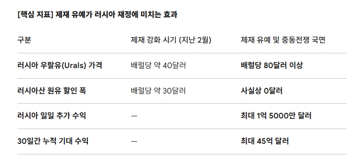 이번 제재 유예의 실질적 효과는 공급량 확대보다 공급 경로의 양성화에 있다. 음성 거래망을 통해 이미 팔리고 있던 원유가 이제 공개 시장에서 정상 가격으로 거래될 수 있게 된 것이다. 결과적으로 국제 유가 하락 압력은 제한적일 수밖에 없다. 반면 러시아 입장에서는 배럴당 최대 30달러에 달했던 '그림자 할인'이 사라지고 정상 단가를 받게 되는 만큼, 같은 물량을 팔아도 수익이 급격히 늘어나는 구조다. 시장에 풀리는 원유의 양이 아니라 러시아가 챙기는 마진이 이번 조치의 핵심 변수인 셈이다.