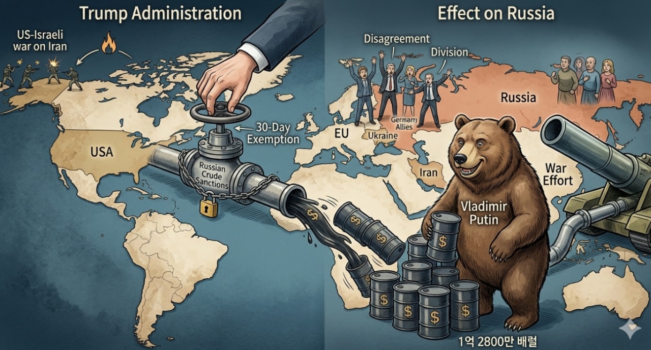 워싱턴포스트(WP)는 지난 14일(현지 시각) 미 재무부가 이미 유조선에 선적된 러시아산 원유 약 1억 2800만 배럴을 30일간 제재 대상에서 제외하는 한시적 조치를 단행했다고 보도했다. 공식 근거는 '유가 안정'이다.