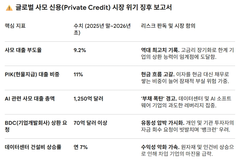 우선 부도율 9.2%다. 데이터센터·소프트웨어 업체 대출 비중이 높은 미국 사모 대출 시장의 부도율은 2025년 말 기준 9.2%로 역대 최고치를 기록했다. 글로벌 금융위기 직후인 2009년 수치를 웃도는 수준이다.