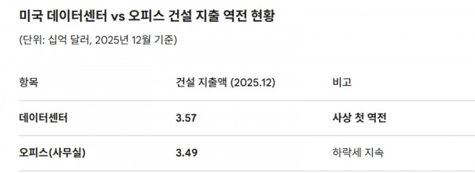 지난해 12월 美 데이터센터 공사비 35억 7000만 달러로 사무실 앞질러