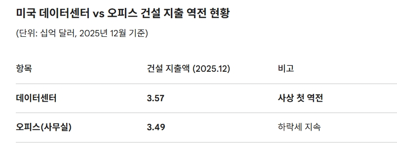미국 건설 통계가 보여준 역전은 단순한 지출 비교가 아니다. AI 연산 수요가 인간 업무 공간의 수요를 구조적으로 압도하기 시작했다는 선언에 가깝다. 전력난과 지역사회 갈등이 속도를 조절할 수 있어도, 방향 자체를 바꾸기는 어려울 것이다.