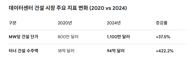 미국 최대 종합 건설사 중 하나인 터너 건설(Turner Construction Co.)은 2024년 한 해 동안 총 94억 달러(약 14조 원) 규모의 데이터센터 프로젝트를 완료했다. 2020년과 비교하면 4년 만에 5배 이상 팽창한 수치다.