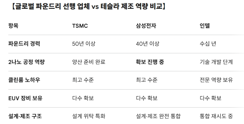 반면 인텔은 막대한 자금과 인력을 투입하고도 초미세 공정 수율 확보에 수년째 어려움을 겪으며 파운드리 사업 재진입이 지지부진한 상태다. 반도체 산업에 정통한 국내 소재·장비 업계 관계자는 "수율은 공정 레시피(Recipe)와 장비 운용 노하우, 소재 특성이 수만 번의 시도 끝에 수렴하는 집적 기술의 결정체"라며 "인텔조차 수십 년 경력을 가지고도 고전하는 영역에, 제조 이력이 전혀 없는 테슬라가 일주일 만에 성과를 낸다는 것은 반도체 산업의 생리를 무시한 발상"이라고 지적했다.
