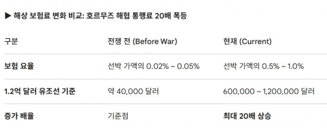 전쟁 전 선박 가액의 0.02~0.05%였던 전쟁 위험 보험료는 현재 0.5~1%까지 올랐다. 시장 가치 1억2000만 달러(약 1785억 원) 규모의 유조선 기준으로, 기존에 최대 4만 달러(약 5950만 원)이었던 보험료가 현재는 최소 60만 달러(약 8억9200만 원)에서 최대 120만 달러(약 17억8500만 원)까지 뛰었다. 해협 단 한 번 통과에 이 비용을 감당해야 하는 구조다.