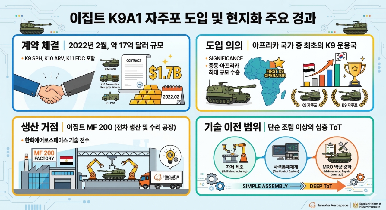 이집트 국방부 산하 '200번 군수공장(Military Factory 200)'은 최근 K9A1 자주포의 초도 생산 라인을 가동하고 본격적인 양산 체제에 들어갔다. 이번 프로젝트는 단순히 한국에서 보내온 부품을 조립하는 수준(Knock-down)을 넘어, 핵심 구성품의 국산화와 제조 공정 전수를 포함하는 포괄적 기술 이전(ToT) 방식으로 진행되고 있다.