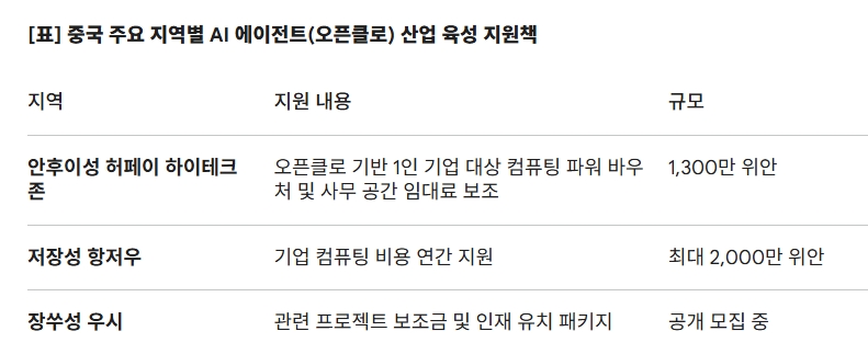 안후이성 허페이 하이테크 존은 오픈클로 기반 1인 기업에 컴퓨팅 파워 바우처와 사무 공간 임대료 보조 명목으로 1300만 위안(약 28억 원)을 책정했고, 저장성 항저우는 기업 컴퓨팅 비용 지원에 연간 최대 2000만 위안(약 43억 원)을 투입하기로 했다.