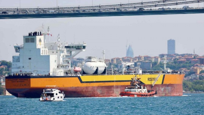 러시아 국적 유조선 블라디미르 모노마흐가 튀르키예 이스탄불에서 보스포루스 해협을 통과하고 있다. 아시아 국가들은 미국이 일시적으로 러시아 석유 거래 금지를 해제한 후 러시아 석유 확보를 서두르고 있다. 사진=로이터