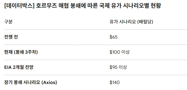국제유가(브렌트유 기준)는 전쟁 발발 전 배럴당 65달러(약 9만 7000원) 수준에서 100달러(약 15만 원)를 넘어섰다. 미국 에너지정보청(EIA)은 향후 두 달 이상 배럴당 95달러(약 14만 2000원)를 웃돌 것으로 전망했다. 악시오스(Axios)는 봉쇄가 장기화할 경우 140달러(약 20만 9900원)까지 치솟을 수 있다고 경고했다.