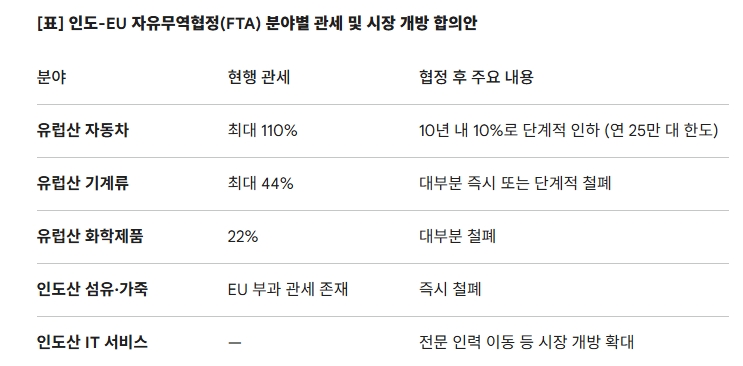 무역 정책 전문 싱크탱크 유럽국제정치경제연구소(ECIPE)는 "이 협정은 인도를 EU 글로벌 가치사슬에 깊이 통합시켜 중국·미국에 대한 과도한 의존에서 벗어나도록 유도하는 구조적 장치"라고 분석했다. 국제법 전문 로펌 DLA 파이퍼(DLA Piper)도 "수십 년 전 중국 시장 개방 이래 유럽 기업들에게 가장 중요한 공급망 다각화 기회"라고 평가했다.