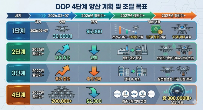 이미지 확대보기미 국방부가 역대 최대 규모의 소형 드론 양산 체제를 가동했다. '드론 도미넌스 프로그램(DDP)'으로 명명된 이 이니셔티브는 헤그세스(Hegseth) 국방장관의 지시로 2025년 12월 출범했으며, 총 11억 달러(약 1조 6500억 원)을 투입해 4단계 건틀릿(Gauntlet) 경쟁을 통해 30만 대 이상의 저가 소모성 단방향 공격 드론(OWA)을 2028년 초까지 양산하는 것을 목표로 한다. 3월 초, 포트 베닝에서 실시된 1차 건틀릿 결과가 발표되어 최초 11개 업체가 선정되었다.