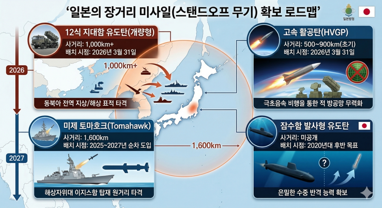일본의 장거리 미사일 확보 로드맵. 인포그래픽=글로벌이코노믹/구글 제미나이