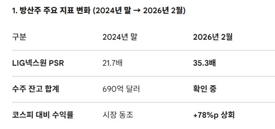 LIG넥스원의 주가매출비율(PSR)이 2024년 말 21.7배에서 2026년 2월 35.3배로 수직 상승했다는 것은, 시장이 이 회사를 일반 방위산업체가 아닌 고성장 기술주와 동일선상에서 평가하기 시작했다는 의미다. 증권가에서는 "현재 주가에는 상당한 낙관론이 이미 녹아 있어, 작은 실망에도 급격한 하방 압력이 가해질 수 있다"는 진단이 잇따른다.