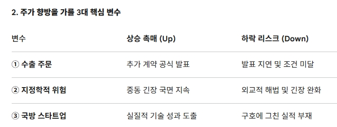 첫째는 수출 주문의 공식 확인이다. 시장은 이미 추가 수주를 기정사실로 반영했다. 공식 발표가 늦어지거나 계약 조건이 기대치를 밑돌면, 그 자체가 시장에 심각한 충격으로 작용할 수 있다.