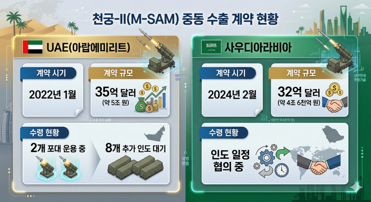 UAE 방공망에는 패트리엇과 사드(THAAD)도 함께 운용 중이어서, 천궁-II는 중간 층위 방어를 담당하는 구조다.