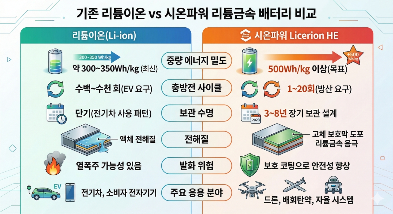 시온파워의 공식 자료에 따르면 라이서리온 HE의 설계 목표치는 500Wh/kg 이상으로, 현존 리튬이온 배터리의 약 300~350Wh/kg을 크게 웃돈다. 이 에너지 밀도 차이가 드론의 비행 시간, 탑재 중량, 작전 반경을 결정짓는다.