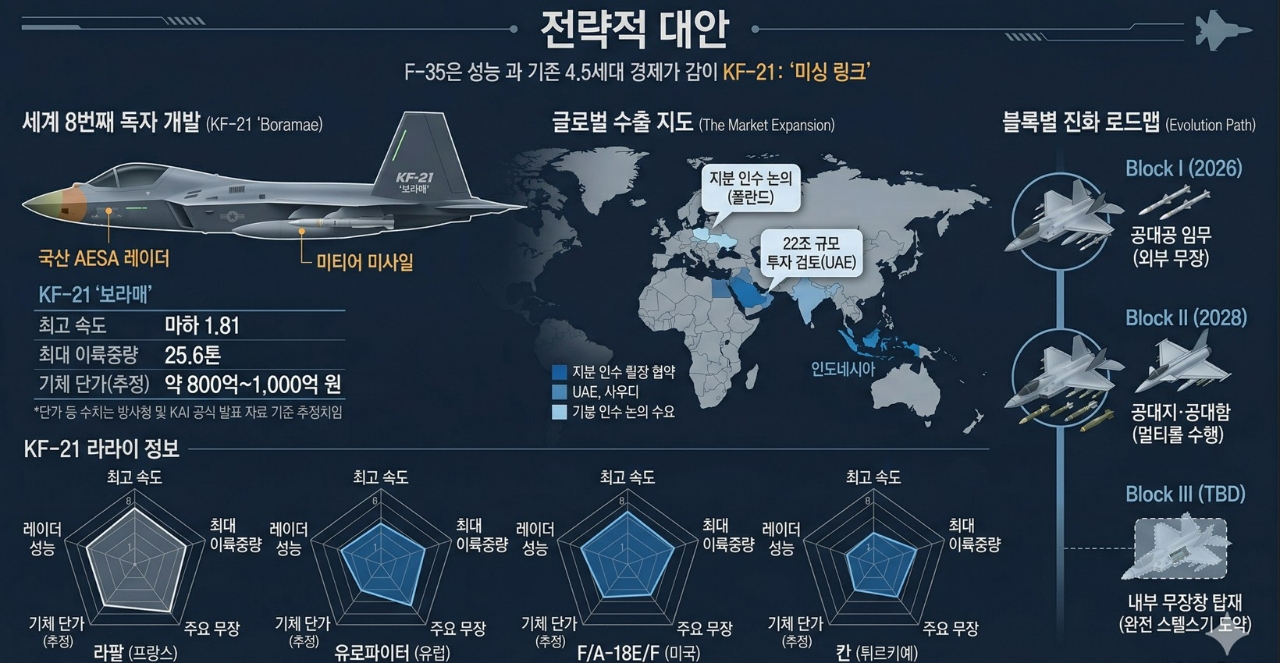 외신이 주목하는 KF-21의 최대 병기는 '전략적 가성비'다. 19포티파이브(19FortyFive)는 KF-21의 강점으로 F-35 대비 낮은 획득·유지비, 미국 수출 승인(EL) 절차에서 자유로운 정치적 유연성, 블록별 업그레이드 가능성을 꼽았다. 특히 이란 전쟁 여파로 항공 전력 증강이 시급하지만 F-35 접근이 제한된 걸프 국가들에 KF-21은 최적의 '전략적 헤지(Hedge)' 수단으로 평가받는다.