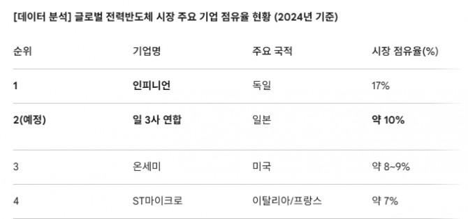 이미지 확대보기미쓰비시전기와 로옴(Rohm), 도시바 등 일본을 대표하는 전력반도체 3사가 각사의 사업부를 하나로 묶는 메가 머저(Mega-Merger) 협상에 전격 착수했다고 닛케이(Nikkei)가 26일(현지시각) 보도했다. 이번 통합이 성사되면 합산 점유율 약 10%를 확보하며 단숨에 세계 2위로 올라서게 된다. 이는 단순한 기업 결합을 넘어, AI 데이터센터와 전기차(EV)라는 거대 시장을 놓고 벌이는 한·일·독 반도체 전쟁의 새로운 분수령이 될 전망이다.