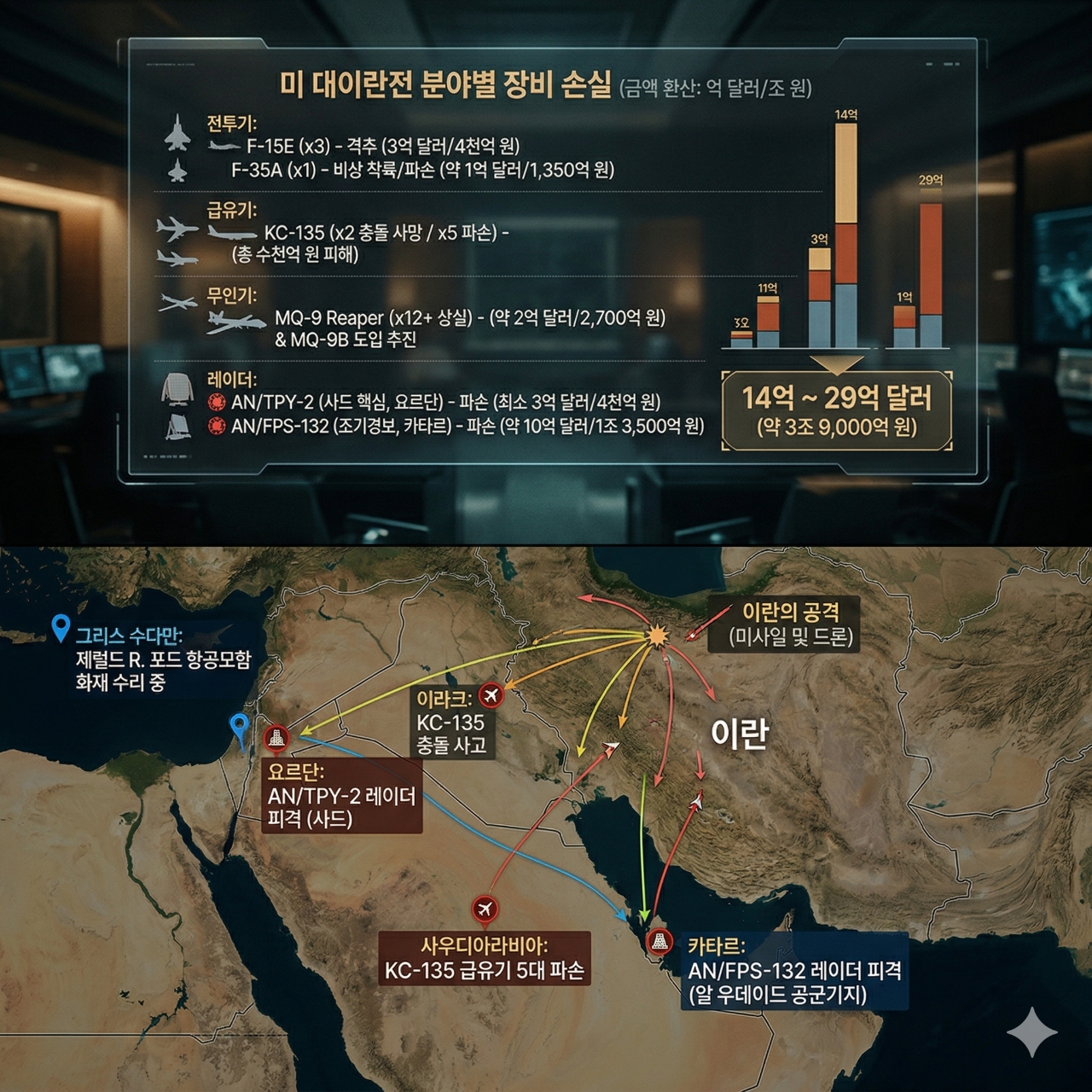 26일(현지 시각) 월스트리트저널(WSJ) 보도에 따르면, 이번 전쟁으로 인한 미군의 장비 피해액은 최소 14억 달러에서 최대 29억 달러(약 4조 3000억 원)에 달하는 것으로 추산된다.