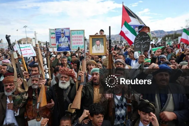 지난 27일(현지시각) 예멘 사나에서 미국과 이스라엘의 이란 공격이 이어지는 가운데 후티 지지자들이 이란과의 연대를 주장하며 시위를 벌이고 있다. 사진=로이터
