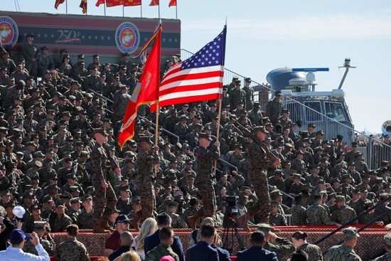 지난해 미국 캘리포니아주 캠프 펜들턴에서 열린 미 해병대 창설 250주년 기념식에서 미 해병대 깃발과 미국 국기가 게양되어 있다. 사진=로이터이미지 확대보기