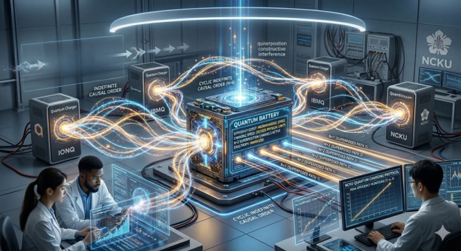 대만 국립 청쿵대학교의 포롱 라이(Po-Rong Lai) 연구팀은 순환적 무한 인과 순서(cyclic indefinite causal order)를 활용 하고 여러 충전 시퀀스를 중첩해 효율성을 높이는 기술을 개발했다.이미지=구글 AI 제미나이 생성