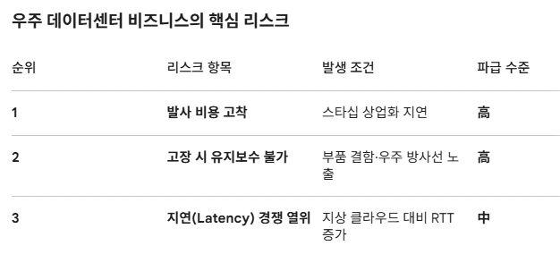 그러나 낙관론에 균형추가 필요하다. 필립 존스턴 스타클라우드 CEO는 "스타클라우드가 지상 시설과 에너지 비용 면에서 진정으로 경쟁력을 갖추는 시점은 스페이스X 스타십(Starship)이 상업 운행을 시작한 뒤인 2028~2029년은 되어야 한다"고 직접 밝혔다. 스타십이 예정대로 비행하지 못할 경우 경제성 달성은 그보다 더 늦어질 수 있다.