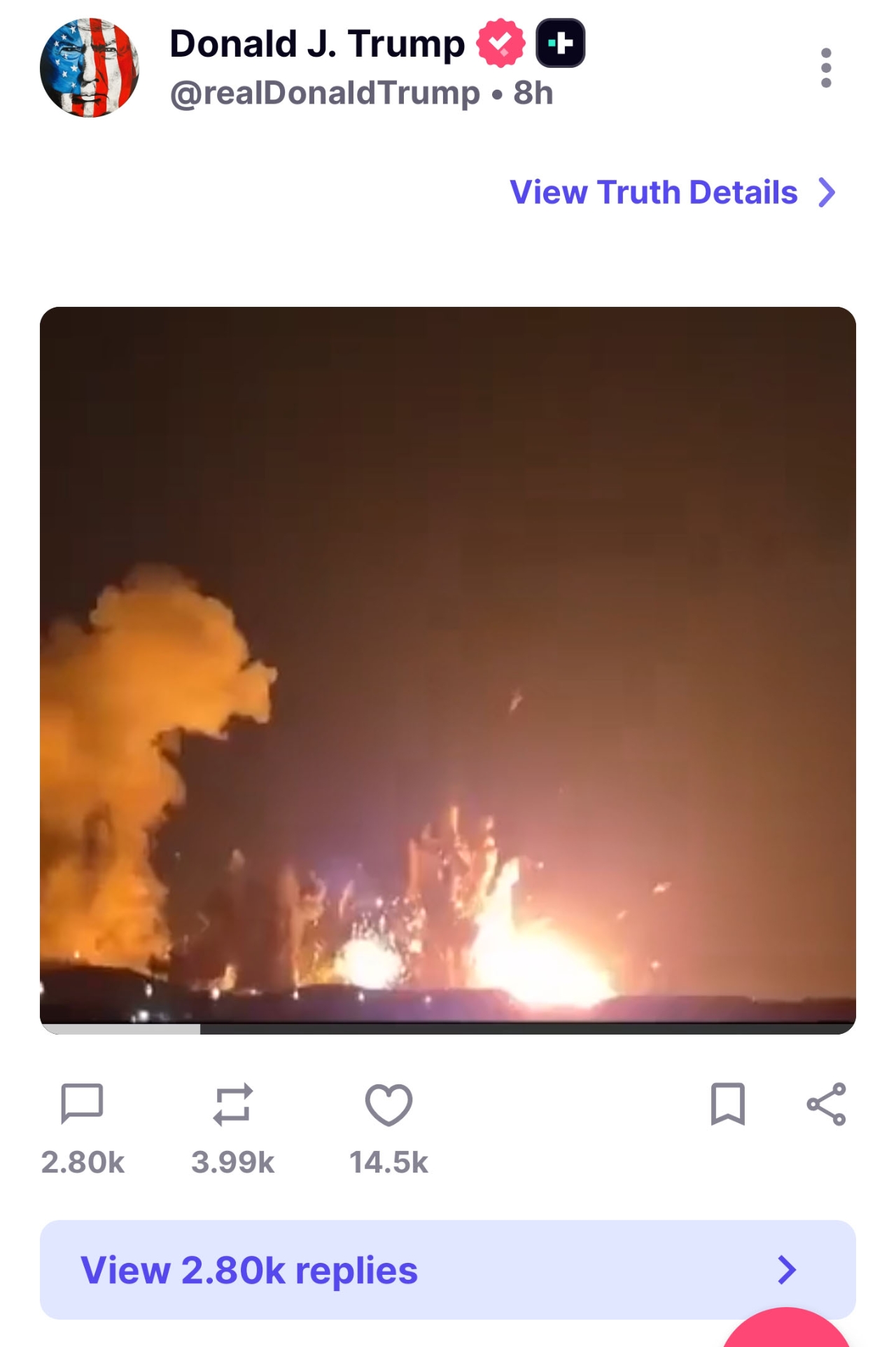 도널드 트럼프 미국 대통령이 자신의 SNS 트루스소셜에 공유한 영상 속에서 폭발이 일어나고 있다. 미국 월스트리트저널은 미 정부 관계자를 인용해 해당 영상이 이란 이스파한의 탄약고 공습 장면을 포착한 것이라고 보도했다. 사진=트럼프 대통령 트루스소셜 캡처