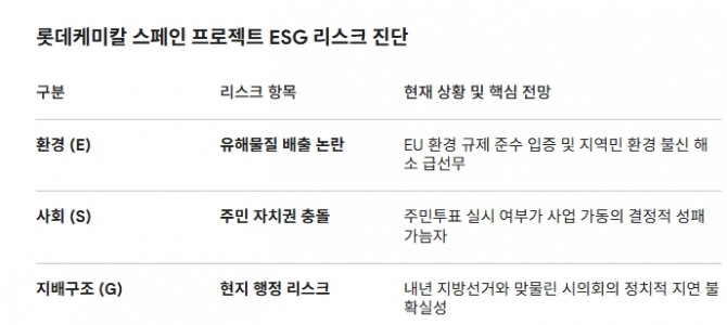 현지 업계 관계자들에 따르면, 롯데 측은 "유럽의 엄격한 환경 기준을 충족하는 친환경 설비"임을 강조하며 투자에 따른 고용 창출 효과를 내세우고 있으나, 주민들의 불신을 뚫기에는 역부족인 모양새다. 롯데의 스페인 프로젝트가 연착륙하기 위해서는 단순한 경제적 효과 강조를 넘어, 현지 민주주의 절차에 부합하는 투명한 소통과 구체적인 환경 보호 대책 제시가 선행되어야 한다.