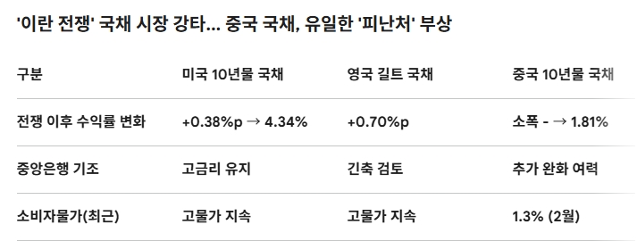 이란 전쟁 개전 이후 미국 10년 만기 국채 수익률은 0.38%포인트 급등해 4.34%를 기록했고, 영국 국채(길트) 수익률은 0.70%포인트나 치솟았다. 채권 수익률 상승은 가격 하락을 의미한다. 반면 중국의 10년물 국채 수익률은 소폭 하락하며 1.81% 수준에 머물렀다.