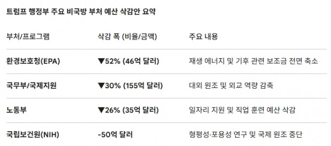 국방비 증액을 위한 재원 마련은 고통스러운 '칼질'을 통해 이뤄진다. 트럼프 행정부는 이를 '정부 낭비 제거'라고 규정했지만, 삭감 폭은 가히 파괴적이다.