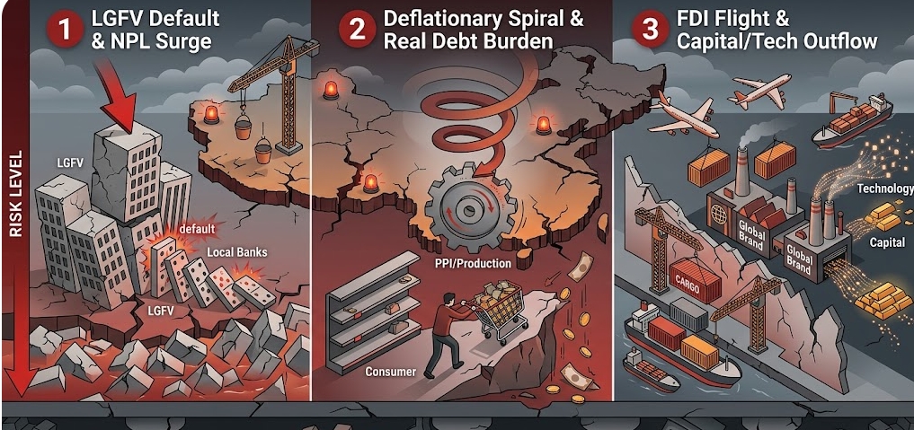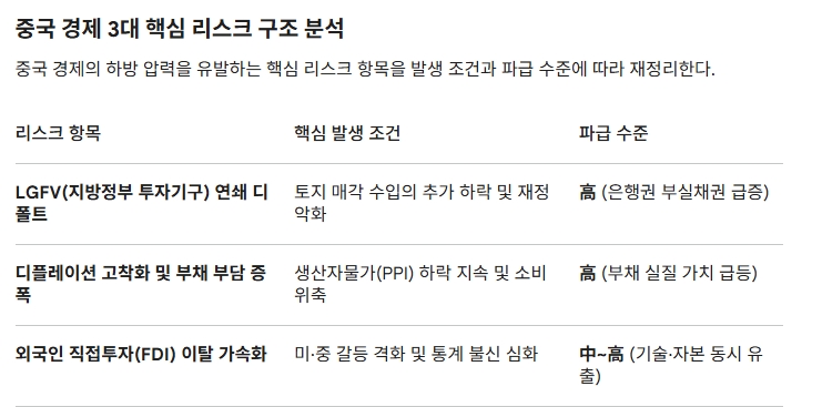 문제는 1차 피해에 그치지 않는다는 데 있다. 지방정부 재정조달 창구인 LGFV(지방융자플랫폼) 부채가 뇌관으로 부상하고 있다. 토지 매각 수입이 급감하면서 LGFV의 원리금 상환 여력이 급격히 약화되고 있으며, 이는 이를 대출해 준 은행의 부실채권(NPL) 증가로 이어지고 있다. 여기에 은행권 밖에서 운용되는 그림자금융(Shadow Banking) 부문까지 부동산 침체의 충격을 흡수하면서, 잠재 리스크는 공식 통계보다 훨씬 클 수 있다는 경고가 잇따르고 있다.