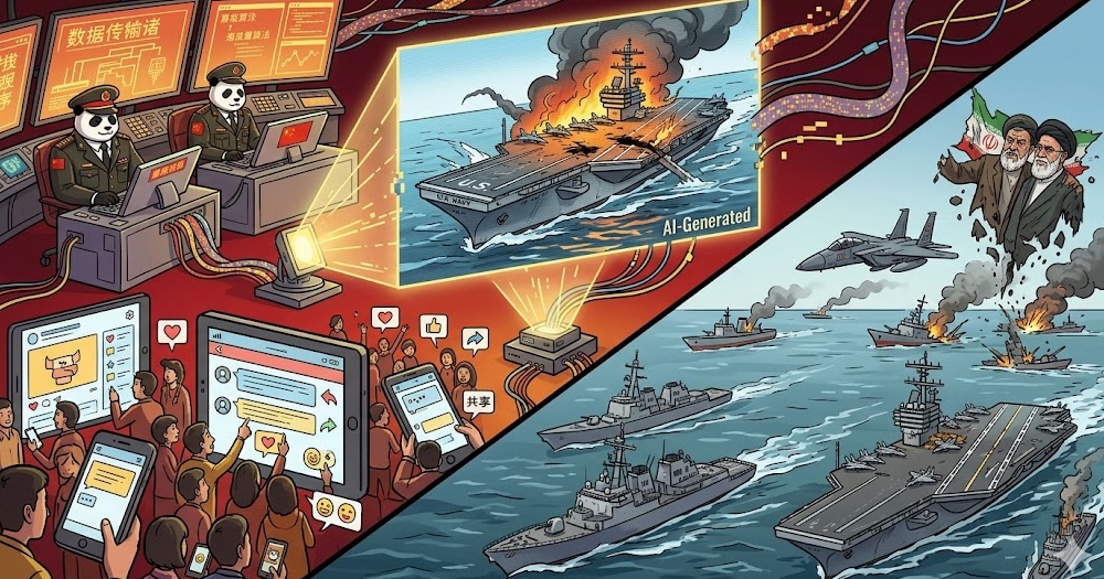 중국 내 동영상 플랫폼 도우인(Douyin)과 콰이쇼우(Kuaishou)에서는 이란군이 미국 항공모함 에이브러햄 링컨함을 격침했다는 AI 생성 영상이 빠르게 확산했다. 에포크타임스가 지난 2일 (현지시각) 보도한 내용에 따르면, 해당 영상은 공개 하루 만에 조회수 1000만 회를 넘어섰다. 더 나아가 중국 국영 방송(CCTV) 앵커 얼굴을 AI로 합성한 딥페이크 앵커까지 등장해 허위 정보에 신뢰도를 인위적으로 높였다.