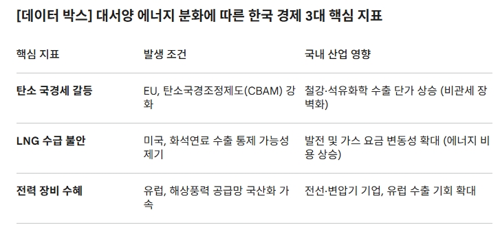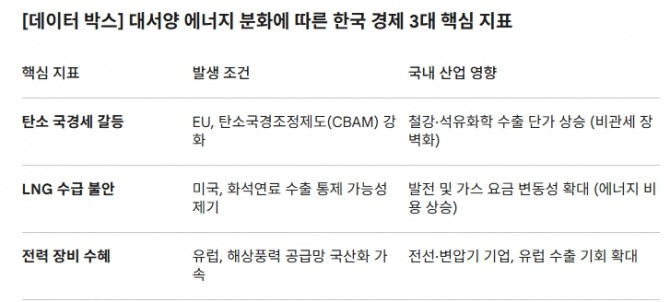 대서양 양안의 에너지 노선 분화는 단순히 남의 나라 이야기가 아니다. 에너지 공급망이 ‘친환경’과 ‘화석연료’ 블록으로 갈라질 경우, 수출 중심인 한국 경제에는 직접적인 타격이 예상된다. 업계 전문가들은 향후 글로벌 시장 향방을 가를 핵심 리스크로 다음 세 가지를 꼽는다.