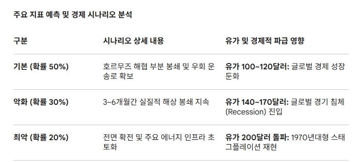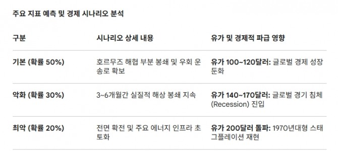 반면 봉쇄가 3~6개월간 실질적으로 지속되는 악화 시나리오(30%)에서는 유가가 140~170달러(약 21만1400~25만6700원)까지 치솟으며 글로벌 경기 침체가 불가피해진다. 가장 경계해야 할 최악의 시나리오(20%)는 군사 충돌이 확대되어 주요 생산 인프라가 초토화되는 상황이다. 유가가 200달러(약 30만2000원)를 돌파하며 1970년대식 초고물가·저성장의 '스태그플레이션'이 지구촌 경제를 덮칠 것이라는 경고가 나온다.