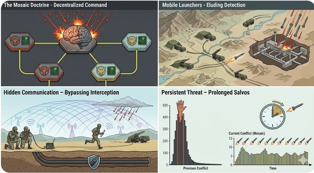 이란 군사 전략의 핵심인 '모자이크 방어'는 중앙 지휘부가 타격을 입어 마비되더라도 각 지역 부대가 독립적으로 전투를 지속하도록 설계된 '세포형(cell) 전쟁 체계'다. 이는 지휘부 제거로 전쟁을 조기에 끝내려는 미·이스라엘의 '참수 교리'를 정면으로 겨냥한 대응책이다.