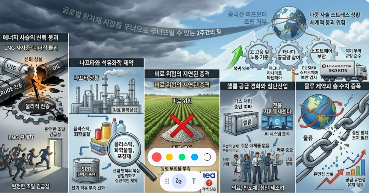 유가 등 단순 벤치마크 가격에 안주하지 말고, 나프타, 비료, 헬륨 등 하위 공급망의 물리적 흐름을 실시간으로 모니터링하여 생산 차질에 대비할 필요가 있다.